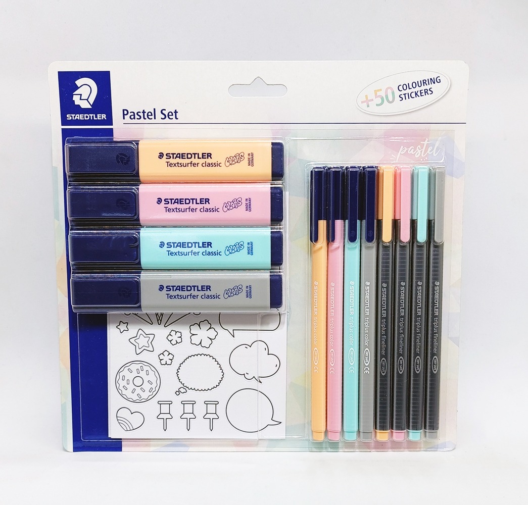 • Contenido de la caja: set de pastel con 4 Textsurfer classic, 4 fineliner triplus, 4 triplus color y stickers para colorear en blíster.